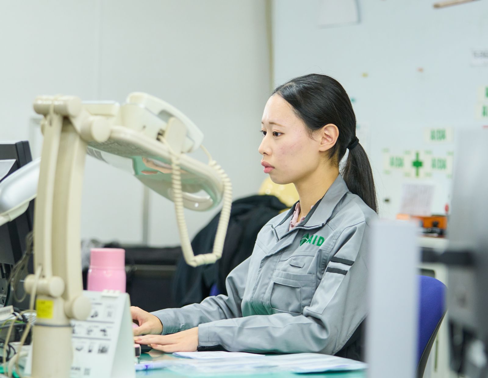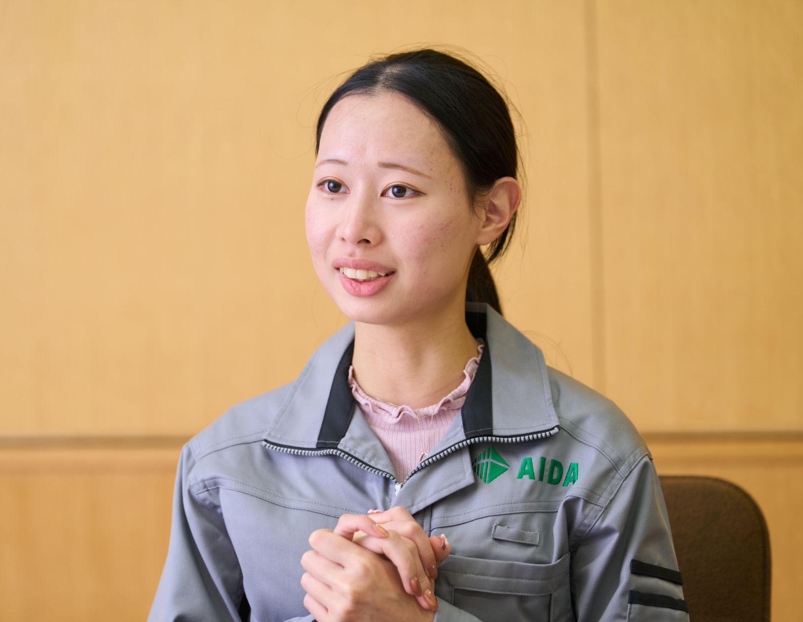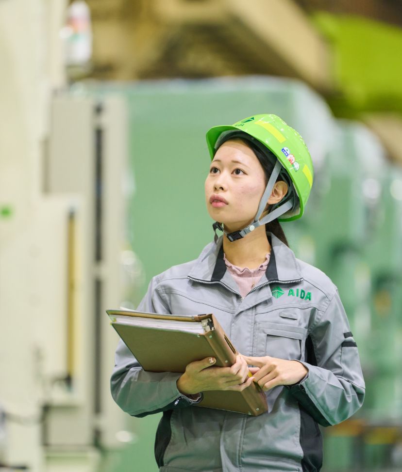 在学中に取得した簿記、ビジネス文書検定、英語検定などの資格を活かしたくて、神奈川県内で事務職の求人があったアイダエンジニアリングに応募しました。志望の決め手は、夏休みの会社見学時にお会いした採用担当の方の人柄です。専門用語を使わずに工場事務の仕事について説明してくださり、30名を超える参加者の質問にも一つひとつ、笑顔で対応されている姿を見て「こんな人がいる会社なら安心できる」と感じました。入社後の自分の姿を、具体的にイメージできたことも大きかったです。
